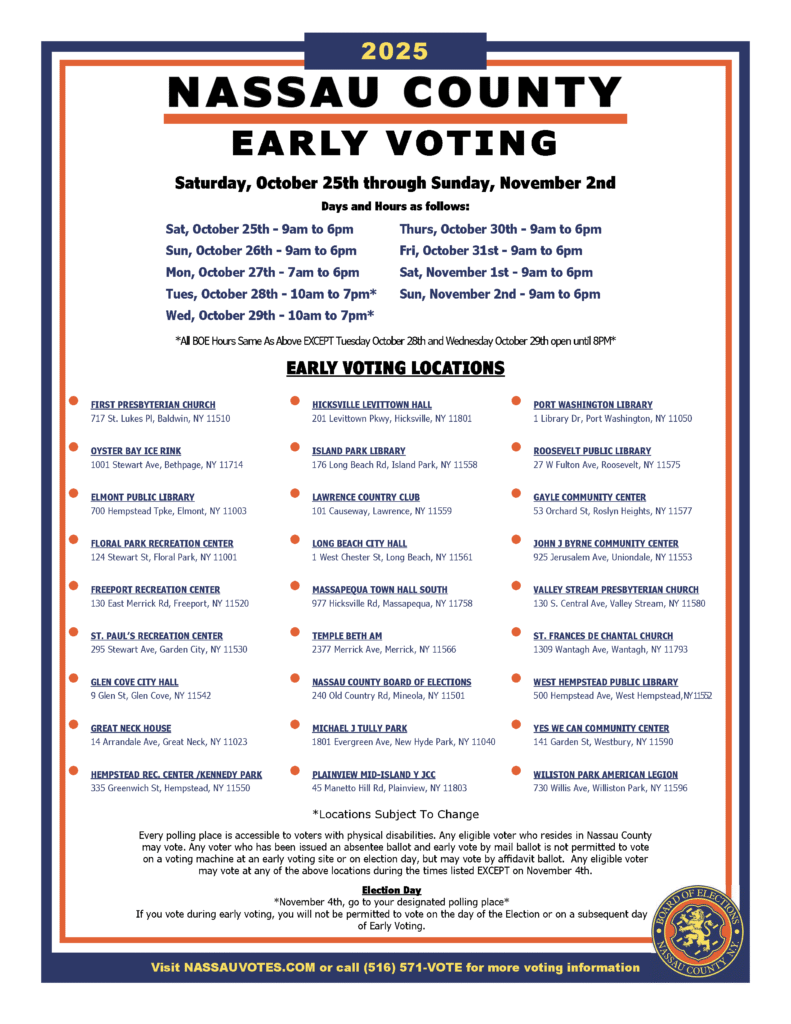 The 2025 General Election is right around the corner, and the John J. Byrne Community Center is excited to announce that we have been selected as an official Nassau County early-voting location! That means you don’t have to wait until Election Day (Tuesday, November 4th)