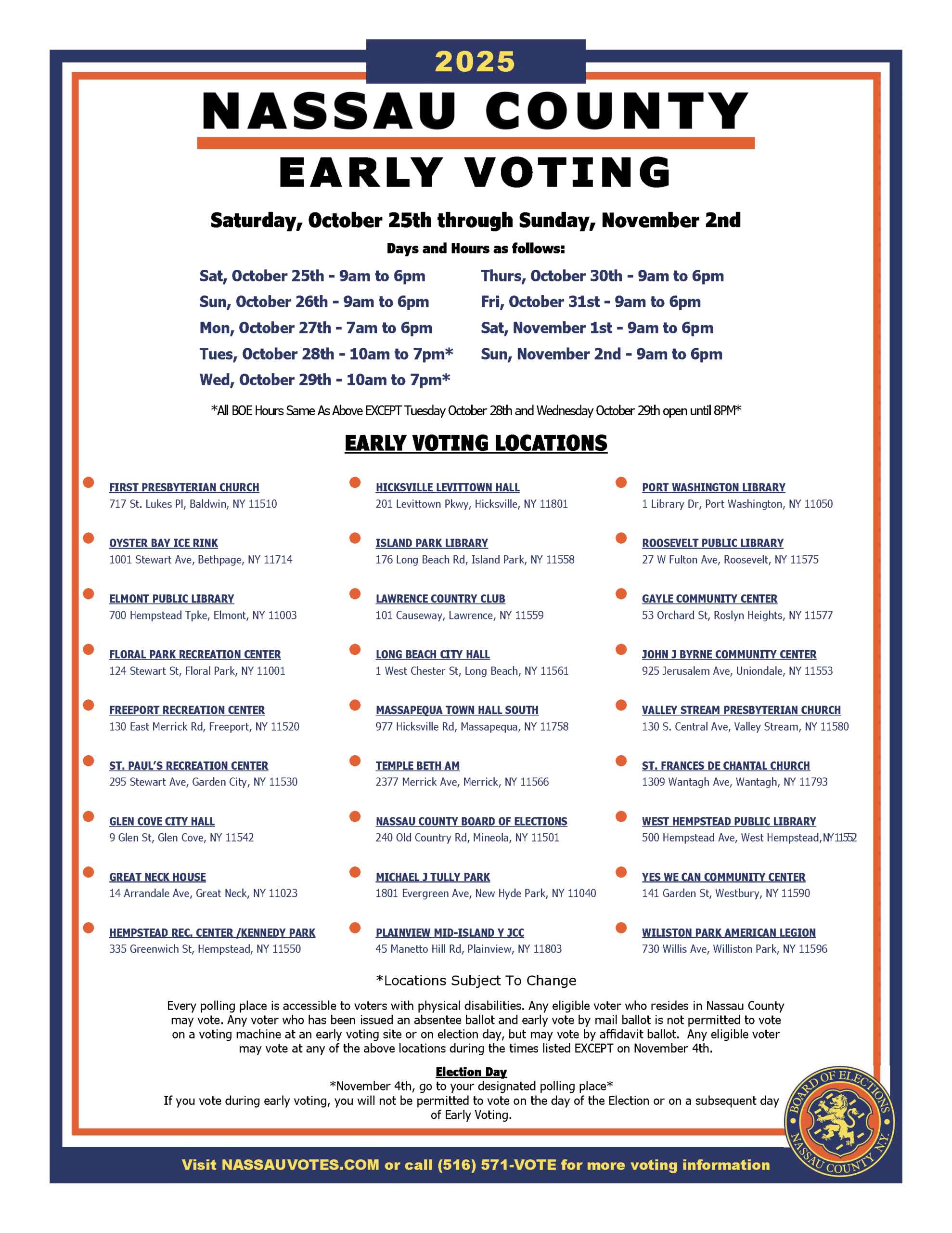 More Info: https://byrncenter.org/the-jjbc-is-proud-to-be-an-early-voting-location-for-the-2025-general-election/ Hours: Sat, Oct. 25: 9am – 6pm Sun, Oct. 26: 9am – 6pm Mon, Oct. 27: 7am – 6pm Tues, Oct. 28: 10am – 7pm* Wed, Oct. 29: 10am – 7pm* Thurs, Oct. 30: 9am – 6pm Fri, Oct. 31: 9am –