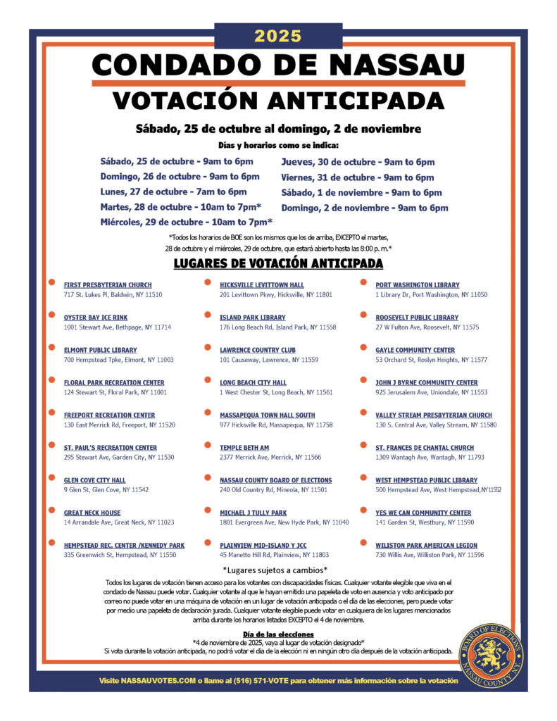 For more information about early voting in Nassau County, visit NASSAUvotes.com or call (516) 571-VOTE.